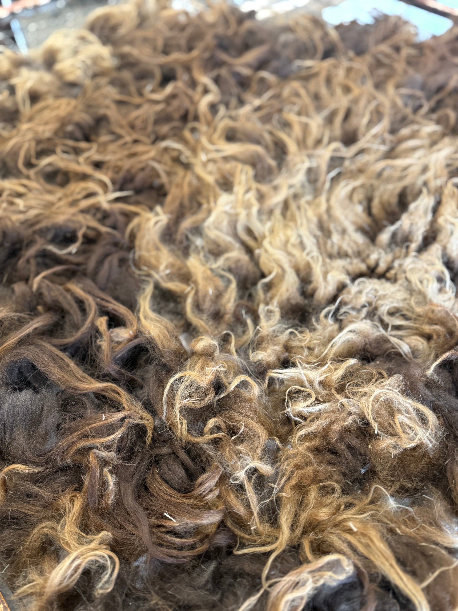 Nella’s fleece is "moorit" in colour in terms of Icelandic sheep meaning she has a brown toned fleece. Her fleece has been lightly skirted weighing in at 1.28 lbs with locks averaging 6 1/2 inches.