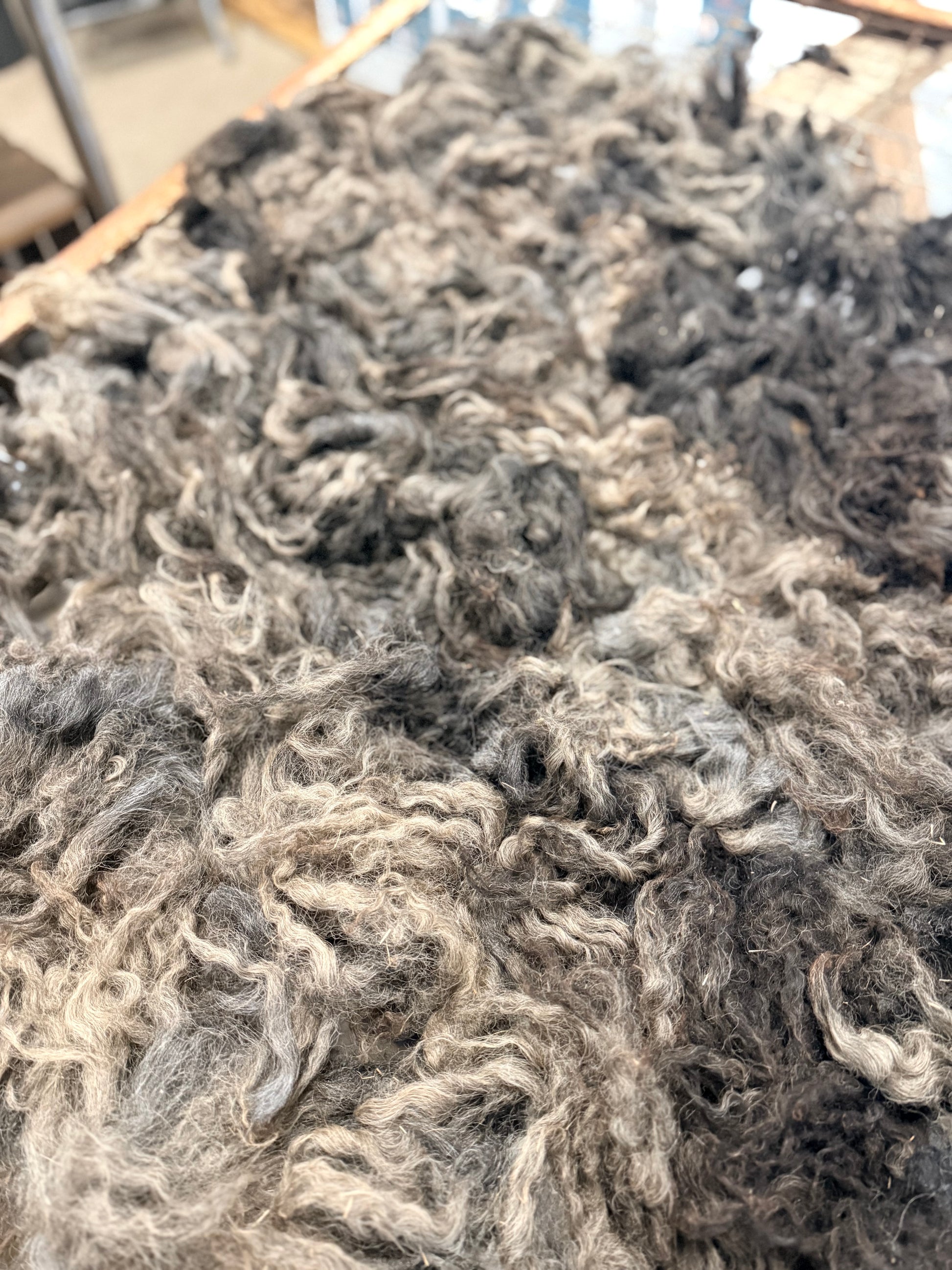 Romeo's fleece is black in colour with tones of dark & light grey. He has been lightly skirted weighing in at 0.98 lbs with locks averaging 6 inches.