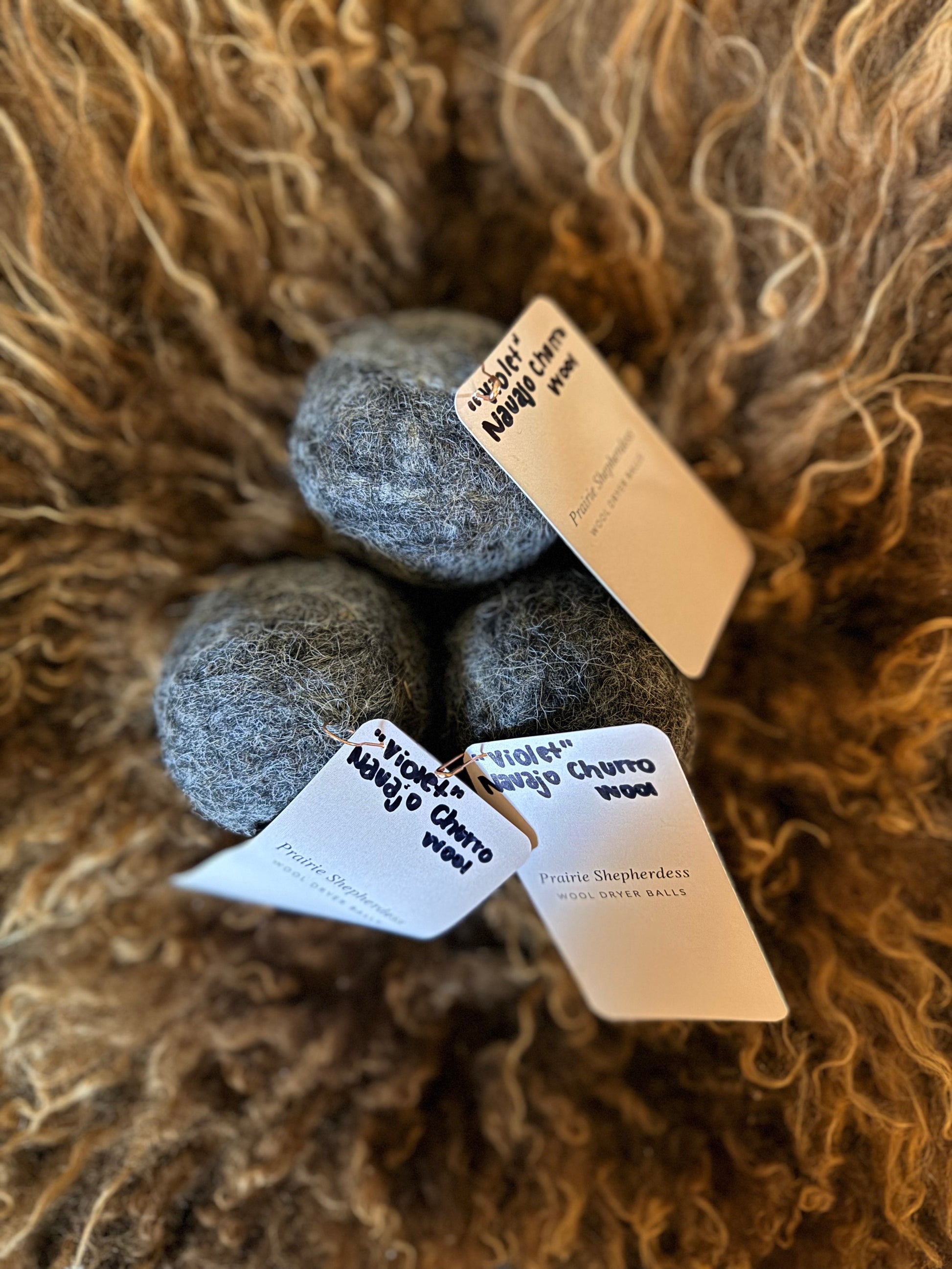 100% wool dryer balls handmade from the fleece grown by Navajo Churro ewe lamb, Violet. This was Violet’s fall 2024 fleece, and was hand processed and felted into dryer balls by me right here on the farm.